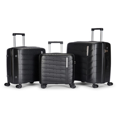 طقم شنط سفر مكون من 3 حقائب أمتعة بعجلات و بتصميم صلب وقوي مصنوع من مادة البولي بوربلين لون أسود